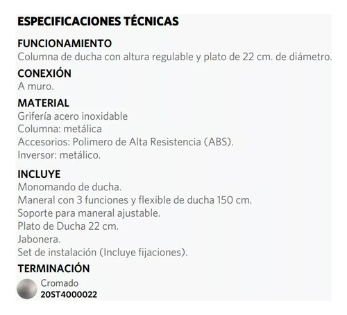 Columna Ducha Stella – Stretto con terminación en cromo. Fabricada con material metálico y ABS para garantizar su durabilidad y resistencia.