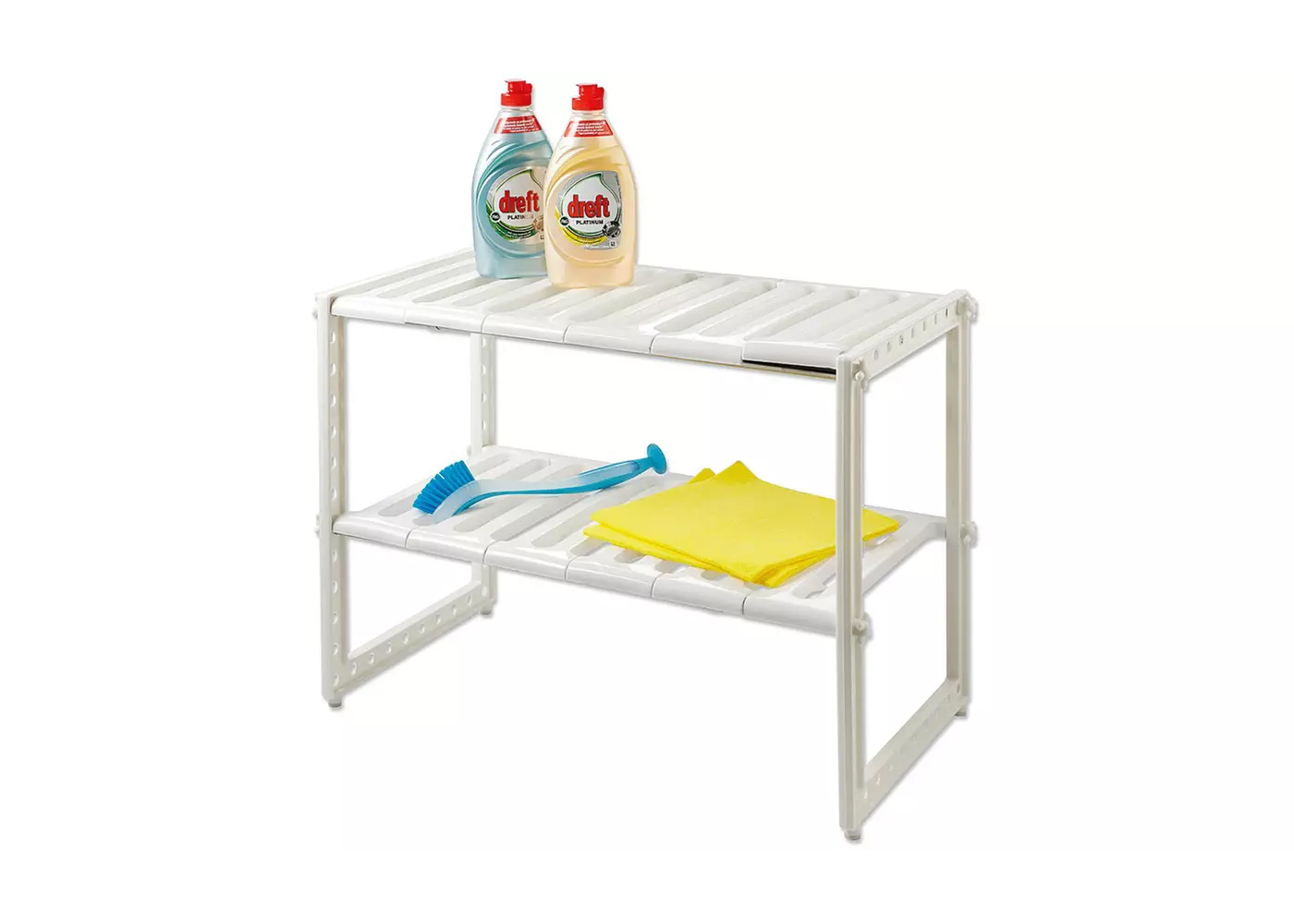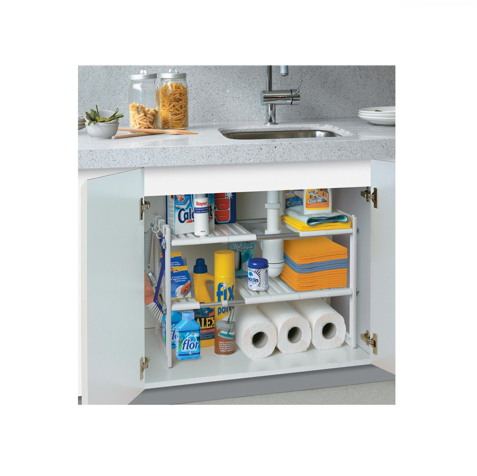 Cómodo y practico organizador de cacerolas, vajilla, y mucho mas. Este organizador puedes ocuparlo dentro del lavaplatos ya que cuenta con partes movibles para mejor adaptación. Puedes ocuparlo igualmente en el mueble de la cocina o debajo del mesón de la cocina, gracias a que cuenta con dos niveles, puede aprovechar los espacios chicos.