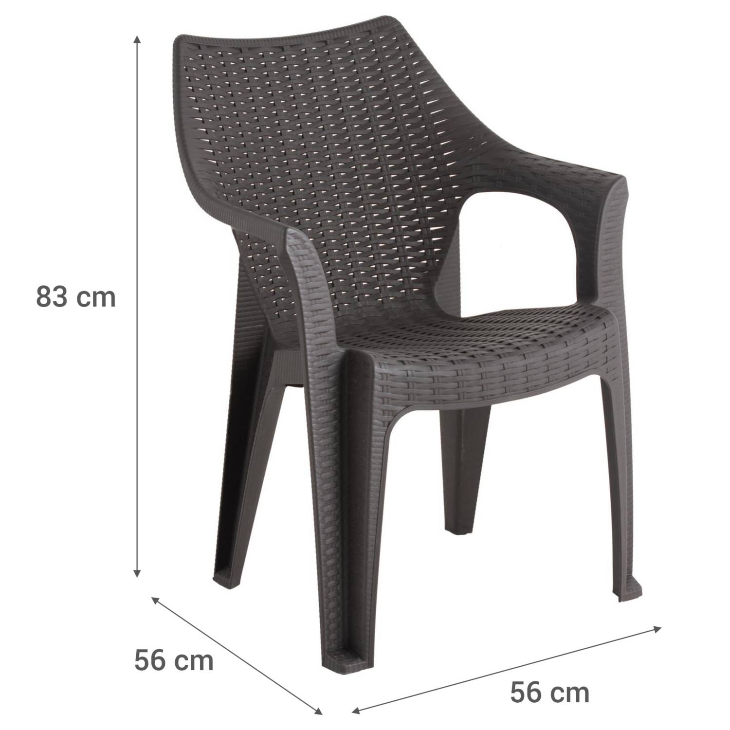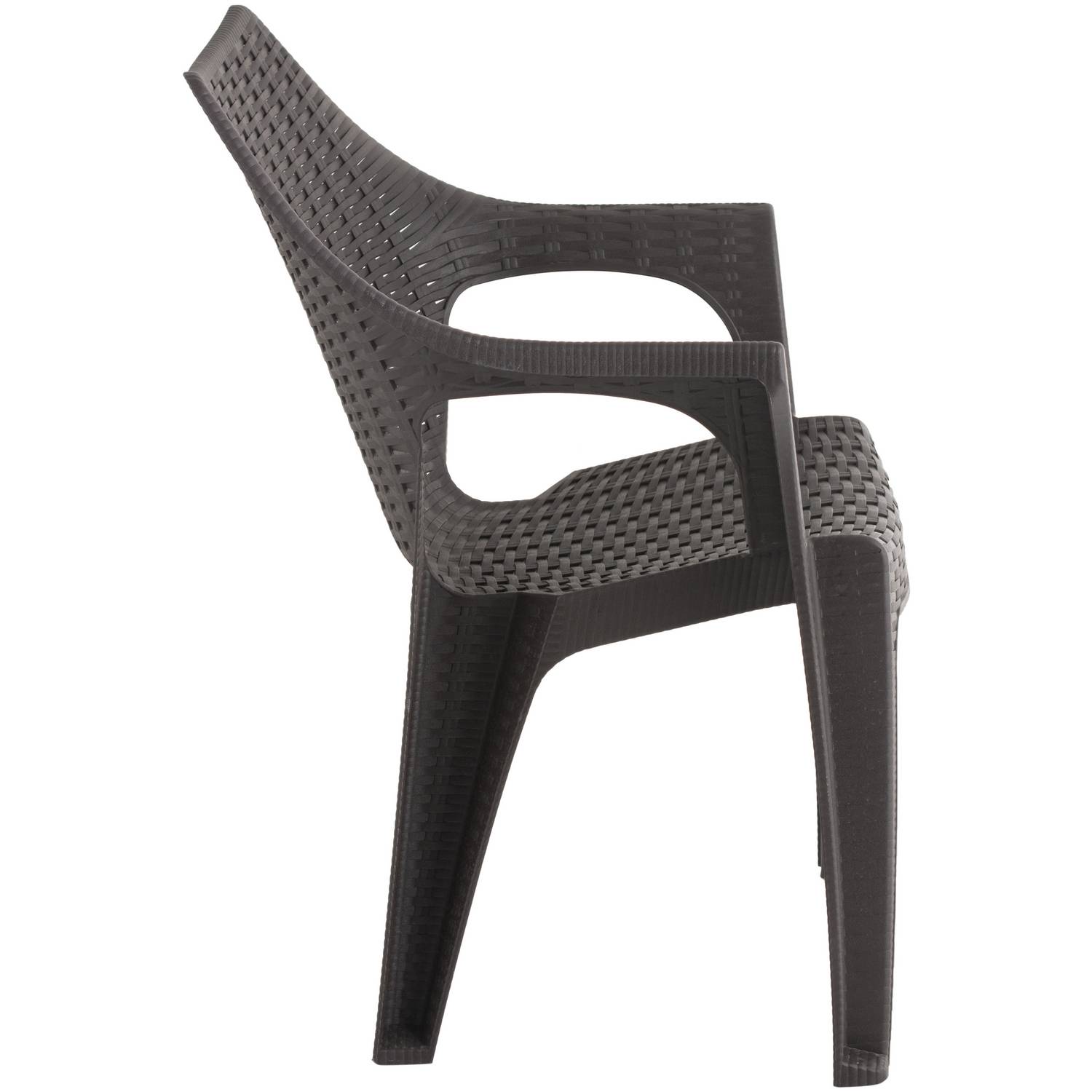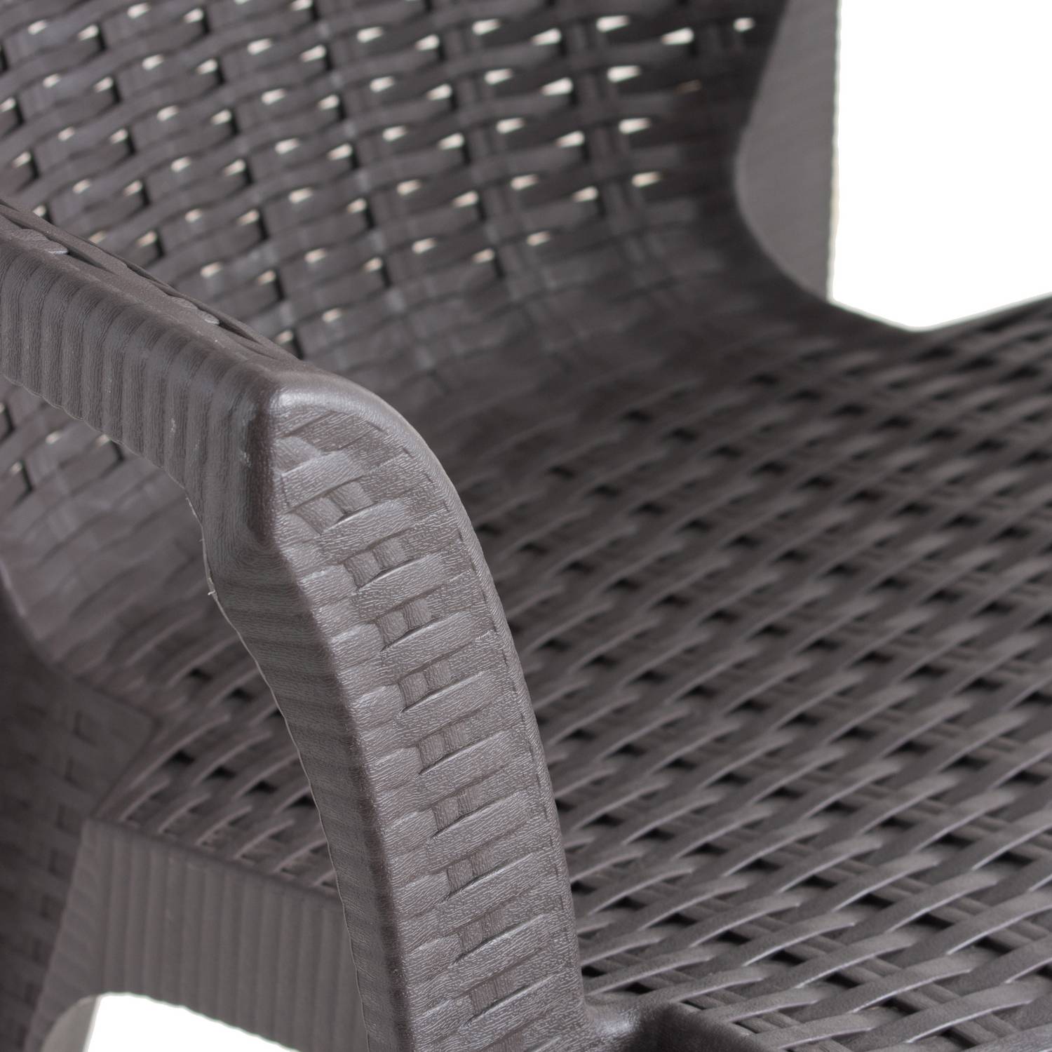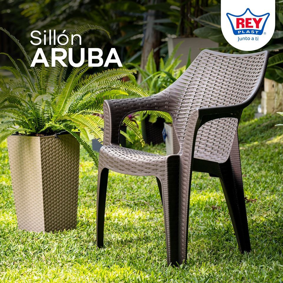 llegan los almuerzos en la terraza y la vida al aire libre. Para esas jornadas inolvidables con amigos y familia, te presentamos la silla, modelo Aruba, que cuenta con apoyabrazos, es de color marrón y puede ser fácilmente apilable por si necesitas más espacio en algún momento. Puede usarse tanto en ambientes interiores como exteriores, porque está fabricada en resina, imitando el tejido de ratán, lo que la hace muy resistente y durable frente a los rayos UV y la lluvia. Respecto al peso, soportan hasta 150 kg.La silla de marca Reyplasy miden 85 cm de alto y 61 cm de ancho. Además, pesa solo 2,7 kg. por lo que podrás transportarla fácilmente